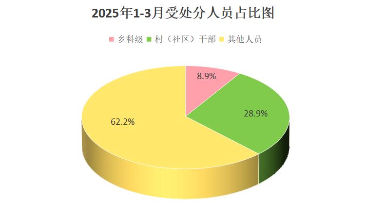 2025年1至3月,全区纪检监察机关共处置问题线索113件,立案60件65人,结案52件,处分45人。受处分人员中,乡科级干部4人,占比8.9 %;村(社区)干部13人,占比28.9%;其他人员28人,占比62.2%。