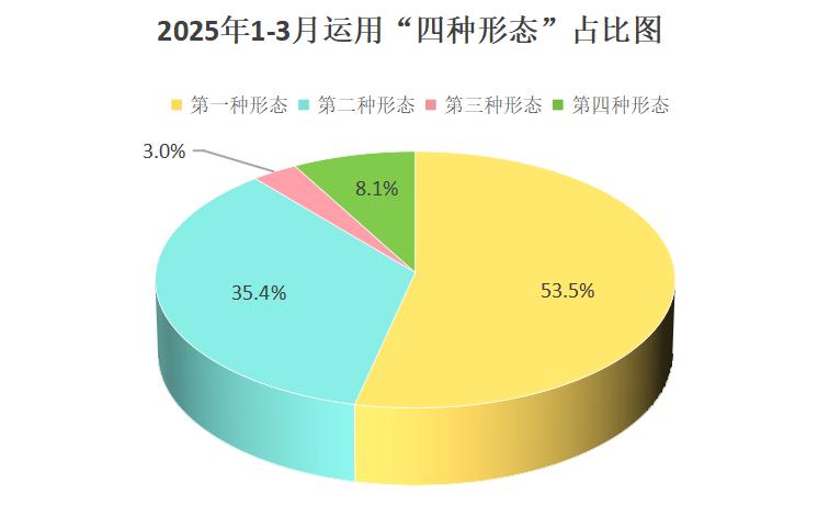 2025年1至3月,全区纪检监察机关运用监督执纪“四种形态”批评教育帮助和处理99人次。其中,运用第一种形态批评教育帮助53人次,占比53.5%;运用第二种形态处理35人次,占比35.4%;运用第三种形态处理3人次,占比3%;运用第四种形态处理8人次,占比8.1%。
