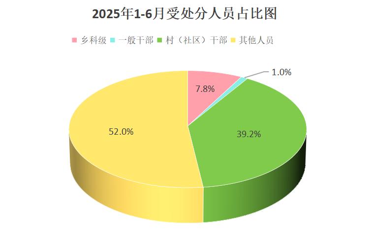 2025年1至6月,全区纪检监察机关共处置问题线索460件,立案124件137人,结案105件,处分102人。受处分人员中,乡科级干部8人,占比7.8%;一般干部1人,占比1%;村(社区)干部40人,占比39.2 %;其他人员53人,占比52%。