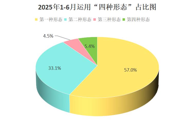 2025年1至6月,全区运用监督执纪“四种形态”批评教育帮助和处理242人次。其中,运用第一种形态批评教育帮助138人次,占比57%;运用第二种形态处理80人次,占比33.1%;运用第三种形态处理11人次,占比4.5%;运用第四种形态处理13人次,占比5.4%。