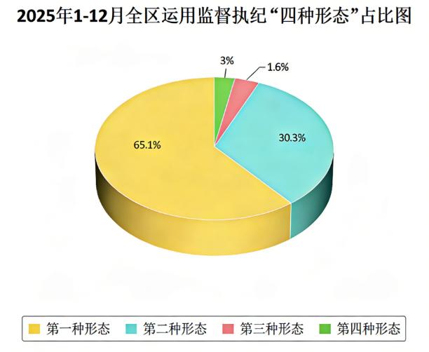 2025年1至12月,全区运用监督执纪“四种形态”批评教育帮助和处理1044人次。其中,运用第一种形态批评教育帮助680人次,占比65.1%;运用第二种形态处理316人次,占比30.3%;运用第三种形态处理17人次,占比1.6%;运用第四种形态处理31人次,占比3%。